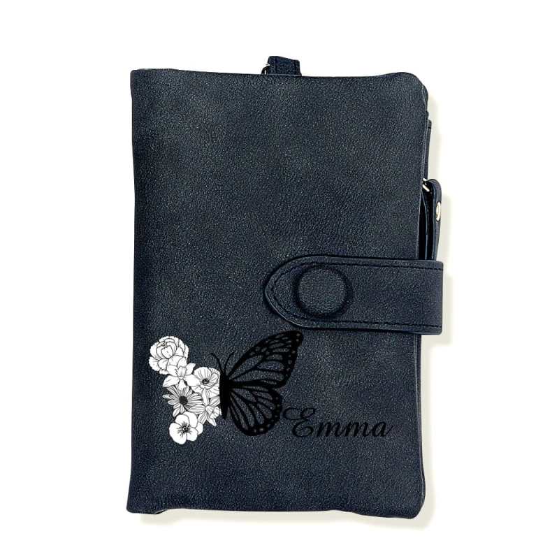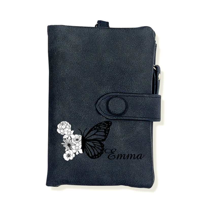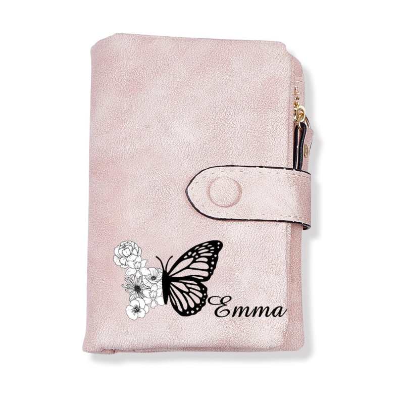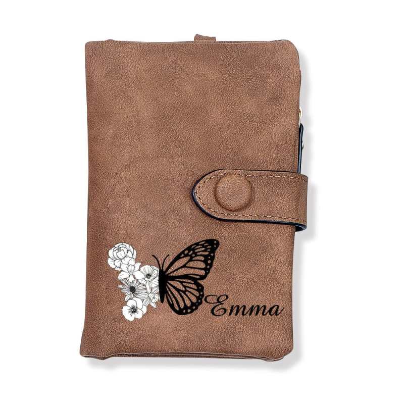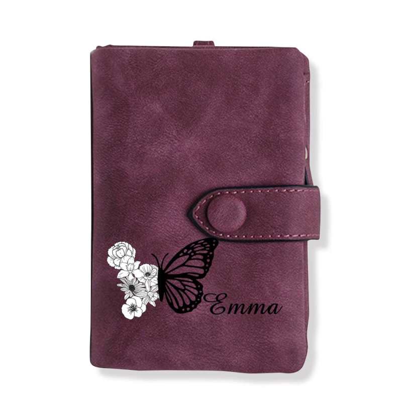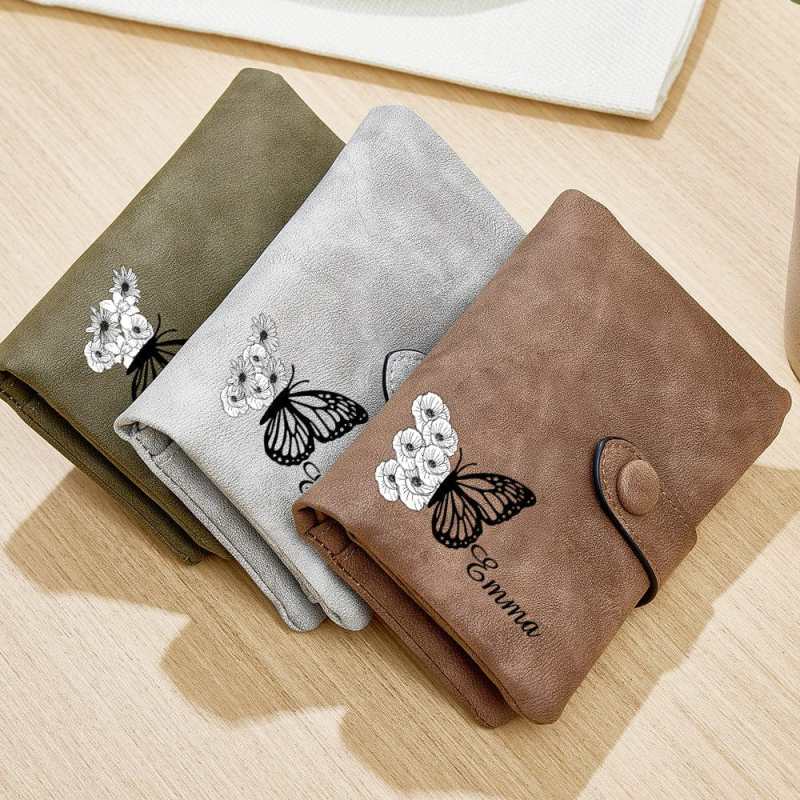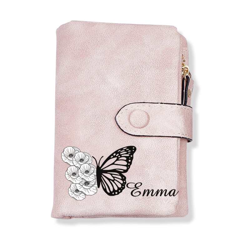 Custom Tri-Fold Butterfly Birth Flower Leather Wallet with Coin Holder Personalized Mother's Day Gift for Woman